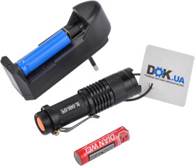 Фонарь поставляется в комплекте с литий-ионным аккумулятором 14500 и зарядным устройством, работающим от сети 220 В. Аккумулятор заряжается несколько часов, но, так как он выполнен в форм-факторе пальчиковой батарейки, на это время в фонарь можно вставить одну из них (тип АА). Правда, свет при этом будет менее ярким. Это плата за высокую мощность установленного диода – в полную силу он может работать только от соответствующего источника питания.