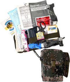 • Склад аптечкибандаж компресійний (ізраїльський), гемостатичний бинт, інструкція по застосуванню, маркер перманентний, ножиці тактичні, оклюзійна наліпка, рукавички медичні нестерильні, підсумок, термоковдра, трубка назофарингеальна, джгут-турнікет SAM XT, лейкопластир, картка постраждалого, бинт марлевий стерильний
