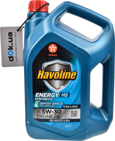 CF, SNМоторна олива Texaco Havoline Energy MS 5W-30 синтетична призначена для легкового та вантажопасажирського транспорту. Використовується в бензинових та дизельних двигунах з прямим упорскуванням палива та турбонаддувом.